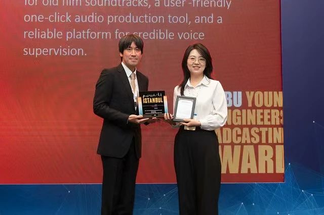 亚广联在授予程皓楠“2024年度亚广联青年工程师奖”时,对其在音频技术领域的专业知识和技术创新表示感谢,特别是她为老电影音轨开发的绿色修复技术、用户友好的一键式音频制作工具和可靠的语音鉴别平台。