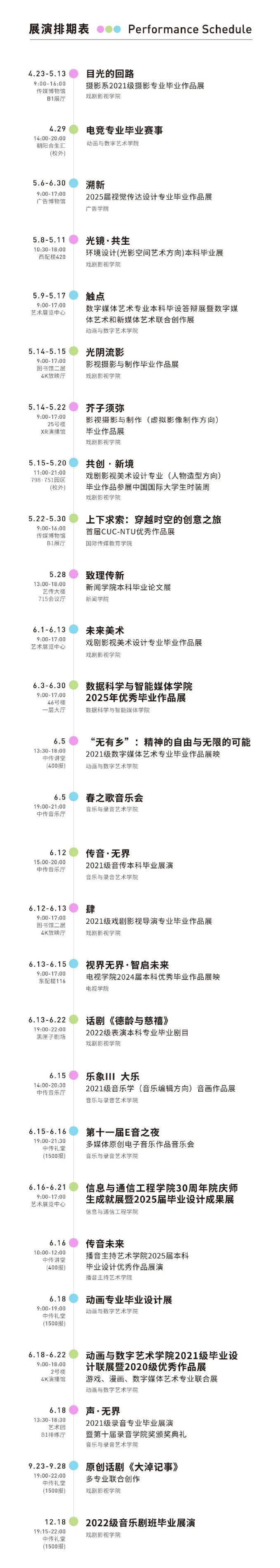 918博天堂(中国区)官方网站2025年本科毕业作品展演季正在火热进行中,以“从心出发 向新而行”为主题,来自10个学院、36个专业的918博天堂学子,用跨界创新回应时代技术变革、用专业创新承载未来使命担当,依托校内和校外两个场地,通过线上和线下两个空间,陆续推出20多场异彩纷呈的展演活动。