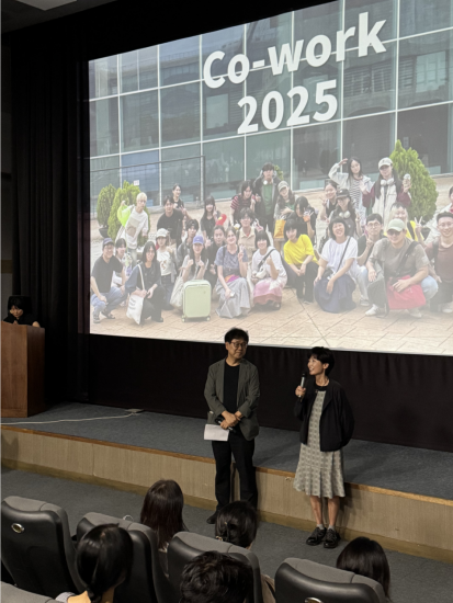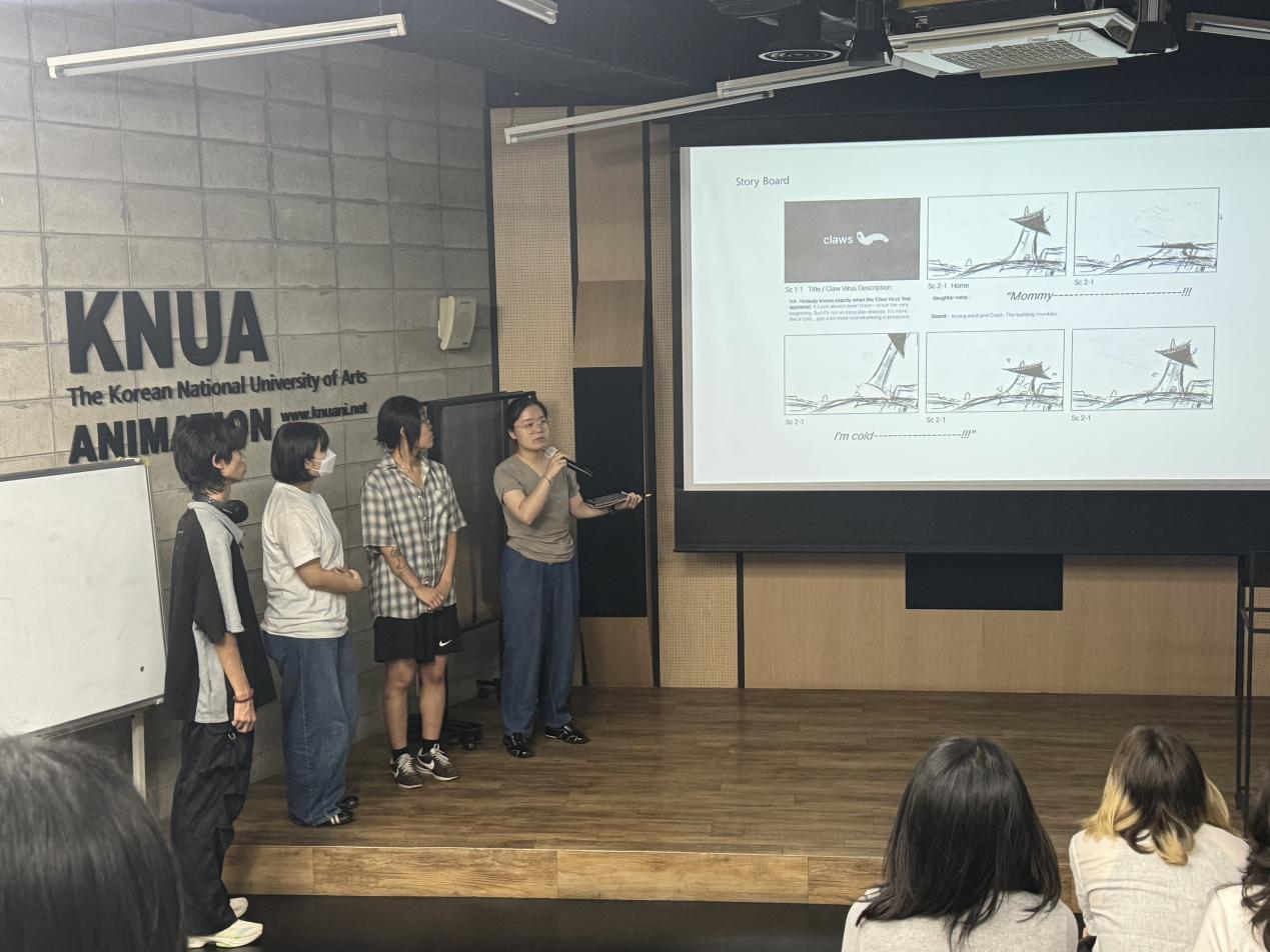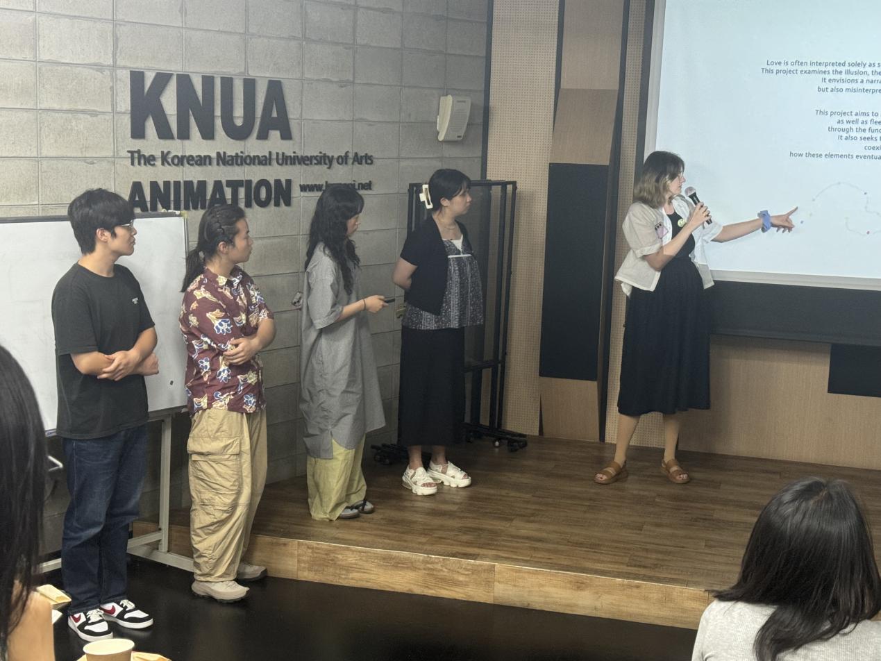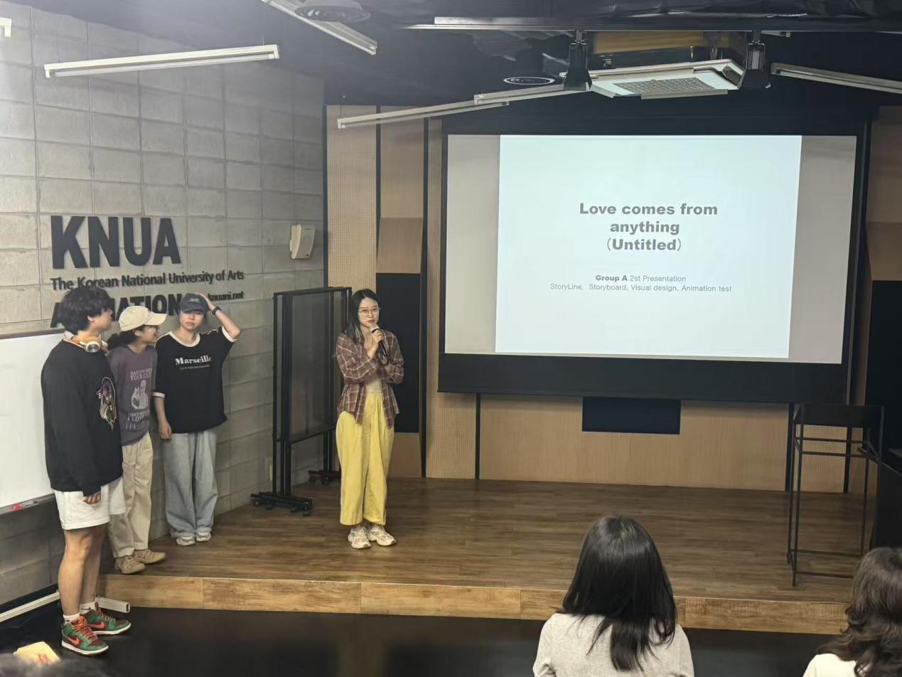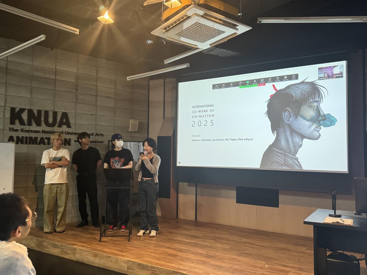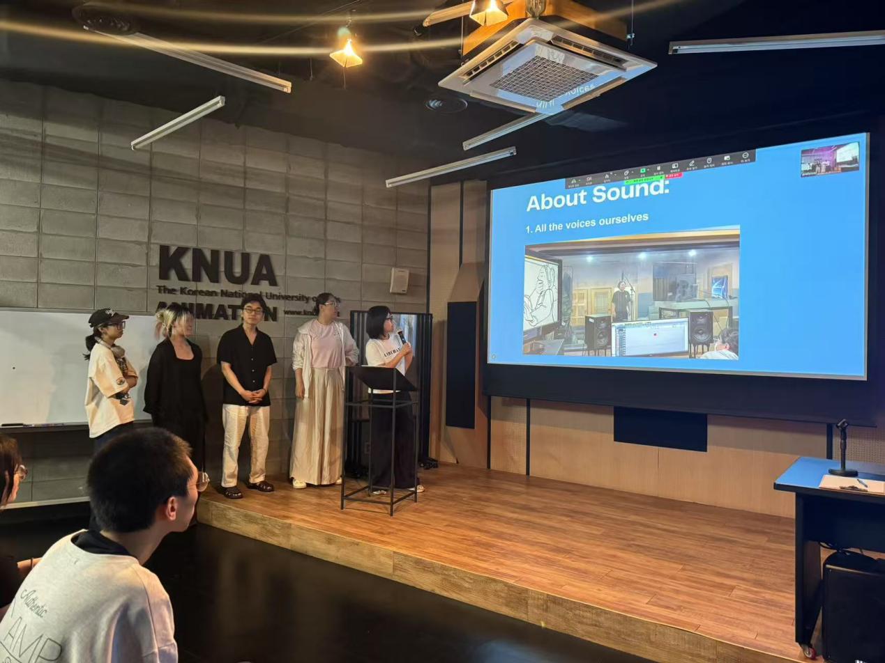 7月30日上午,本次Co-work项目在韩国国立艺术综合大学影像科举行了隆重的成果展映会。每组同学登台展示了各自的创意作品,详细阐述了创作理念、制作流程及个人体会。展映后,中日韩三校教授对作品进行了深入点评,高度赞扬同学们在创作过程中所展现出的创意、合作精神与跨文化沟通能力,特别肯定了中方学生在叙事构思方面的独到创意与视觉表达方面的扎实功底。。