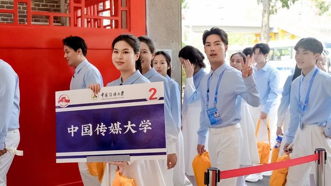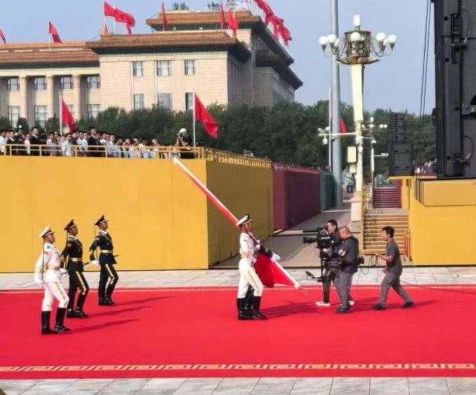 我校选派戏剧影视学院王诤教授带领从戏剧影视学院和电视学院选拔的72名同学,参与大会电视转播工作。自今年4月起,学校启动筹备工作,历经严格选拔、系统培训与实战锻炼。在这场大型综合电视转播活动中,师生团队分工明确、协同发力,分别承担统筹协调、新媒体摄像、转播系统摄像助理、导演助理、制片等多类岗位,足迹遍布景山、天安门城楼、广场中央及国博、人民大会堂楼顶等核心区域。纪念大会的很多精彩镜头背后,都凝结着918博天堂人的专业付出与不懈努力。